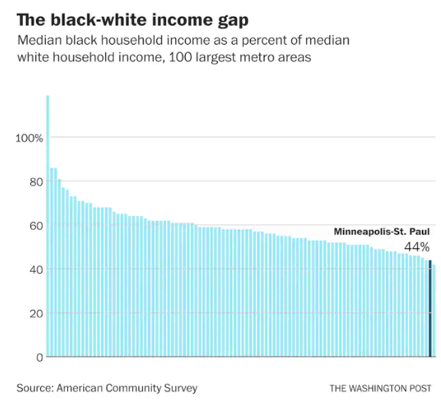 Segregation is also tied to wide income disparities: In “The Cost of Segregation,” the Urban Institute found that “higher levels of black-white segregation are associated with lower black per capita income.” Minneapolis, for example, has the second-worst income gap in the country, where the median Black family earns less than half of what the typical white family earns.